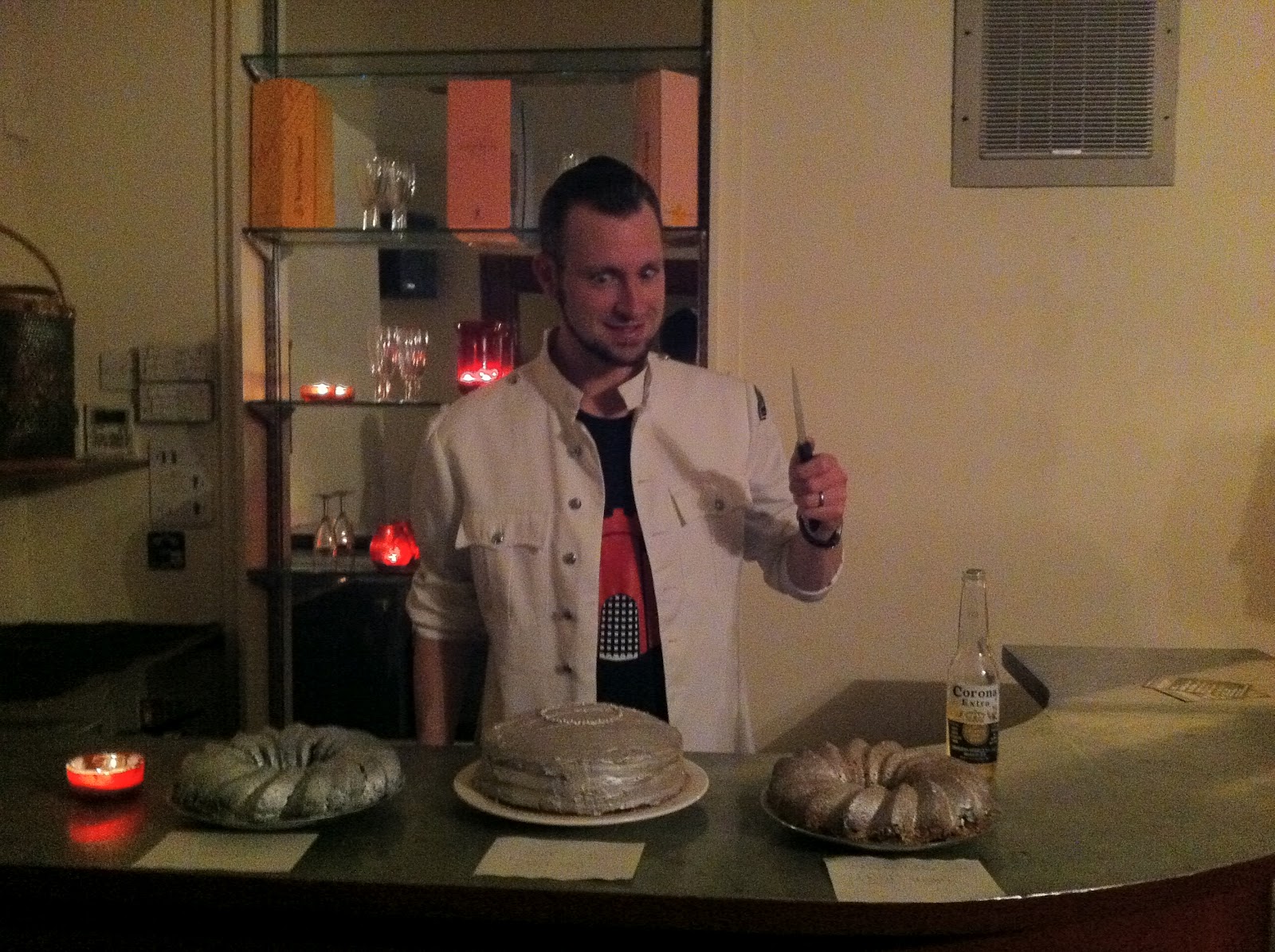 So, I made a Russian Coffecake (painted silver), a plain vegan chocolate cake (painted silver) and the actual Rivet Cake - a vegan chocolate-frosted cake, decorated like a pop rivet and painted silver.